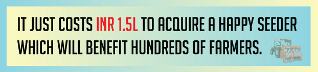 These Happy Seeders will be given to farmers in Sonipat & Panipat regions through the "rent & use" model. INR 1.5L is an indicative price and may be subject to a 10% variation depending on the acquisition, storage and maintenance (the cost of which will be worked out by the NGO after acquiring the Happy Seeders). Through this model, one Happy Seeder Machine can easily benefit 100 farmers at different times of the year. One Happy Seeder Machine can easily benefit 100 farmers as they will be using it at different times.