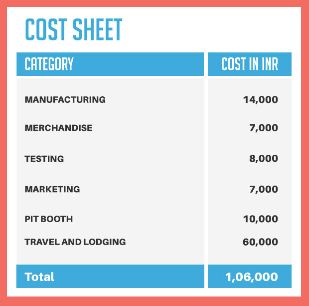 Team Godspeed has made a budget of INR 1.06 lacs for various activities. This includes car manufacturing, pit display, testing, travel, marketing and merchandise.