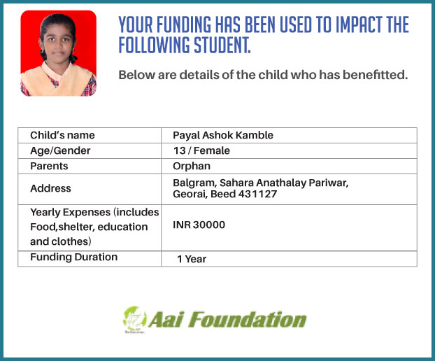 To ensure that there is complete transparency I shall get a report from Balgram (this takes between 1 to 3 months usually after the funds are raised & transferred to them) telling me who benefitted from the funding. The details will then be posted on the UPDATES section of my campaign and will be in a format like the one below. As soon as I post an update, the platform will send an EMAIL alert to all the funders - i.e. to you. Click on the link on the email and you can read about which child benefitted. That's transparent right.