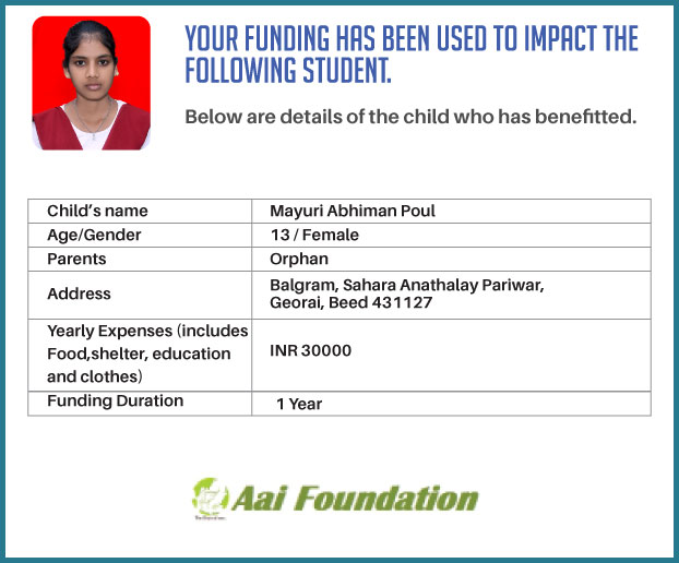 To ensure that there is complete transparency I shall get a report from Balgram (this takes between 1 to 3 months usually after the funds are raised & transferred to them) telling me who benefitted from the funding. The details will then be posted on the UPDATES section of my campaign and will be in a format like the one below. As soon as I post an update, the platform will send an EMAIL alert to all the funders - i.e. to you. Click on the link on the email and you can read about which child benefitted. That's transparent right.