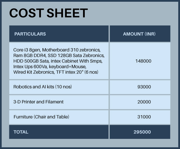 These skills will prepare them for future careers and help reduce the digital divide. The total cost to set up this lab is INR 2.78L.