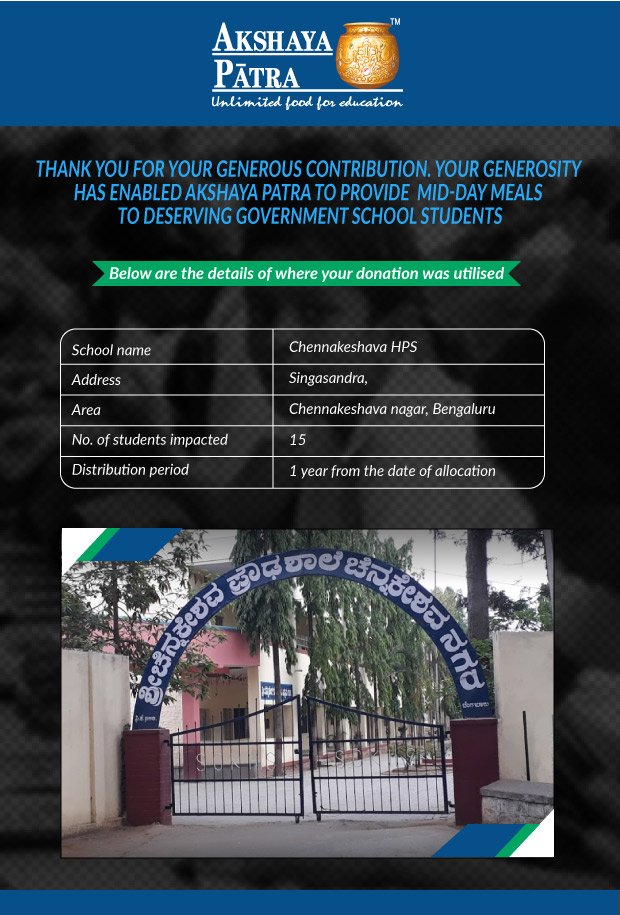 I am doing this campaign to raise awareness and funds for the Akshaya Patra Foundation. Funds raised would be used to provide wholesome school lunch to children in rural areas across Karnataka under the Mid-day meal program.