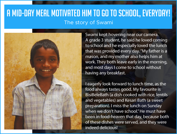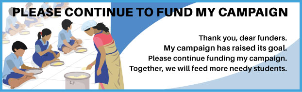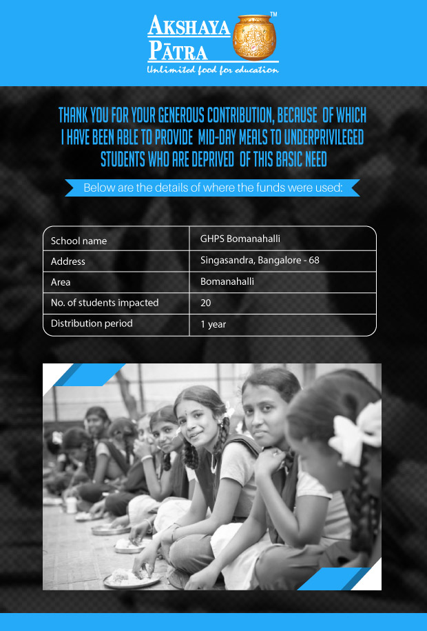 I am doing this campaign to raise awareness and funds for the Akshaya Patra Foundation. Funds raised would be used to provide wholesome school lunch to children in rural areas across Karnataka under the Mid-day meal program.