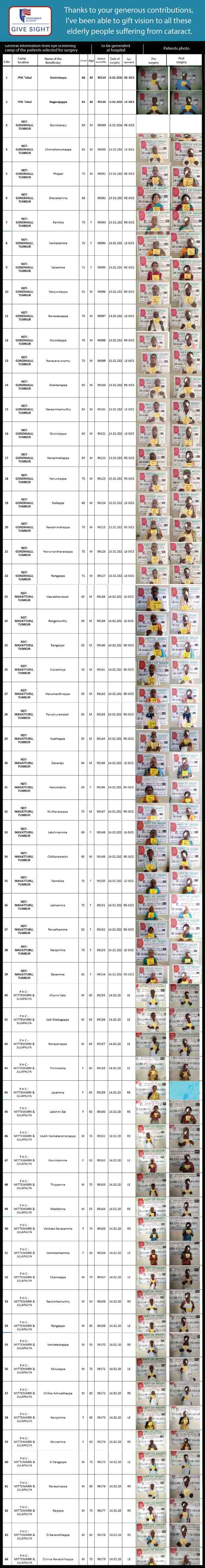There are 3 hospitals where these surgeries will be done. All 3 hospitals are managed by the GLOBE EYE FOUNDATION (GEF). The hospitals are located in Kolar, Hoskote and Chintamani.