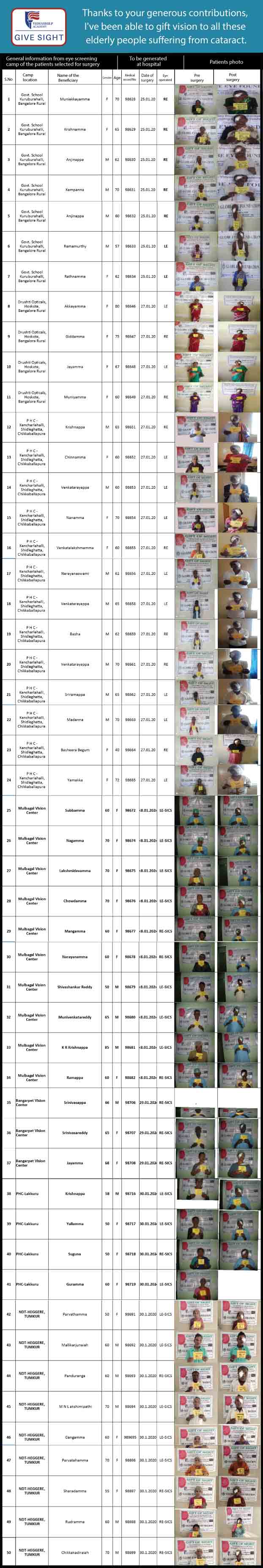 The money raised will be given to our partners - Rotary Bangalore Indiranagar & they will pay the amounts to the NGO – Globe Eye Foundation. Once the money is given, the Globe Eye Foundation will use it to do cataract surgeries for the elderly poor in villages in the Hoskote, Kolar & Chintamani area and share the details with me. I shall then post an update giving you details of the elderly whose eyesight has been corrected so that you know where your money has gone.