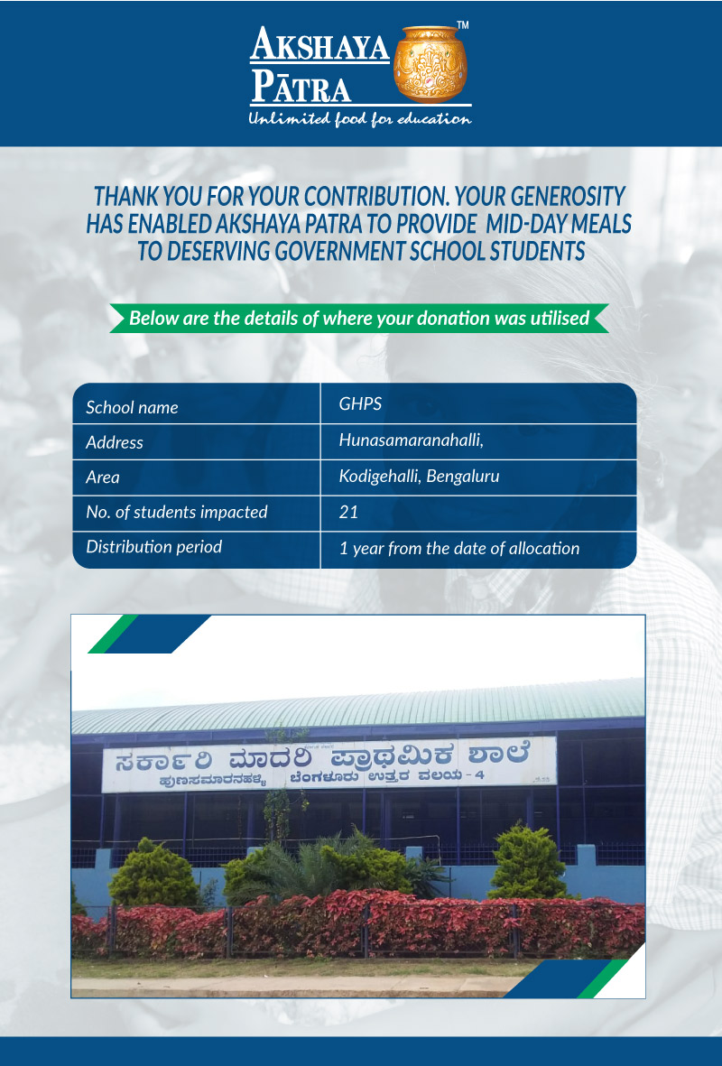 I am doing this campaign to raise awareness and funds for the Akshaya Patra Foundation. Funds raised would be used to provide wholesome school lunch to children in rural areas across Karnataka under the Mid-day meal program.