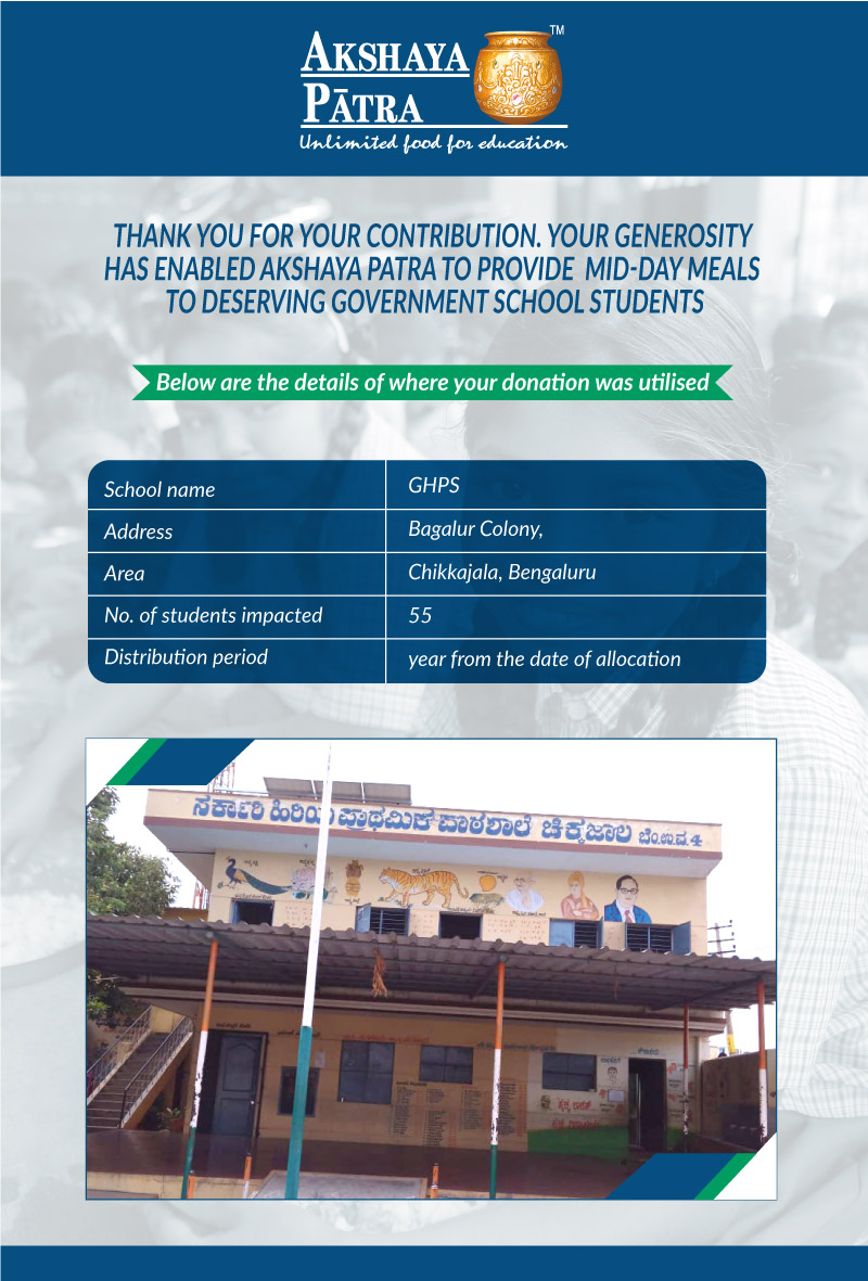I am doing this campaign to raise awareness and funds for the Akshaya Patra Foundation. Funds raised would be used to provide wholesome school lunch to children in rural areas across Karnataka under the Mid-day meal program.