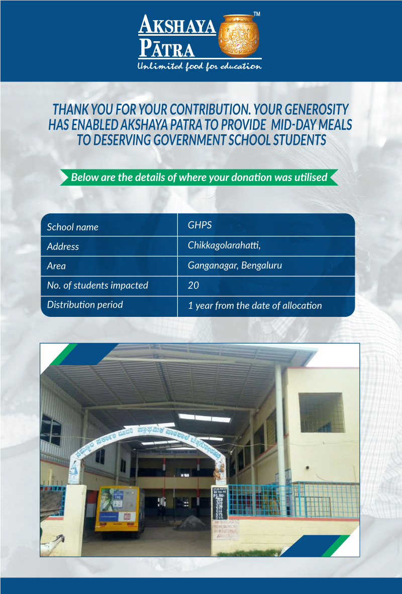 I am doing this campaign to raise awareness and funds for the Akshaya Patra Foundation. Funds raised would be used to provide wholesome school lunch to children in rural areas across Karnataka under the Mid-day meal program.