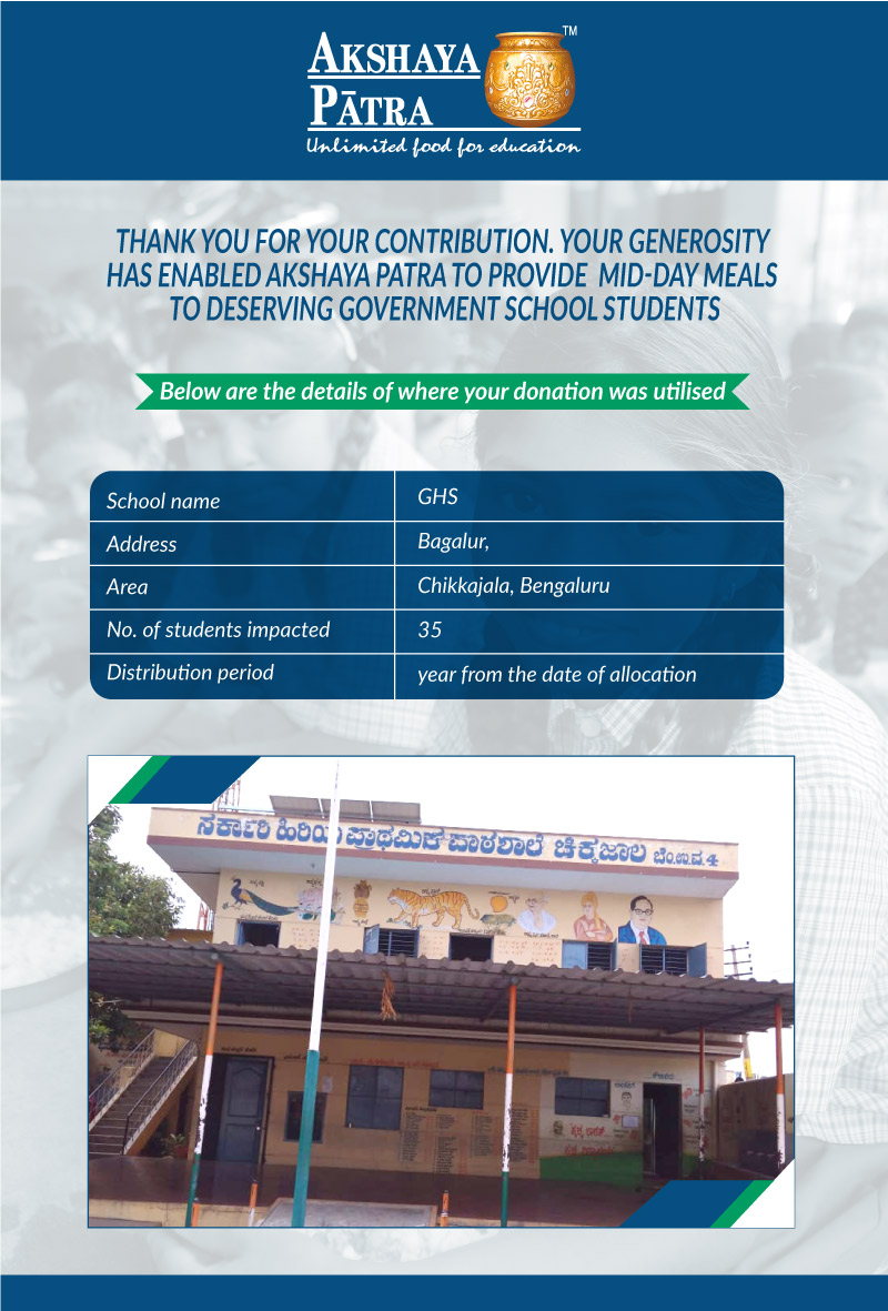 I am doing this campaign to raise awareness and funds for the Akshaya Patra Foundation. Funds raised would be used to provide wholesome school lunch to children in rural areas across Karnataka under the Mid-day meal program.