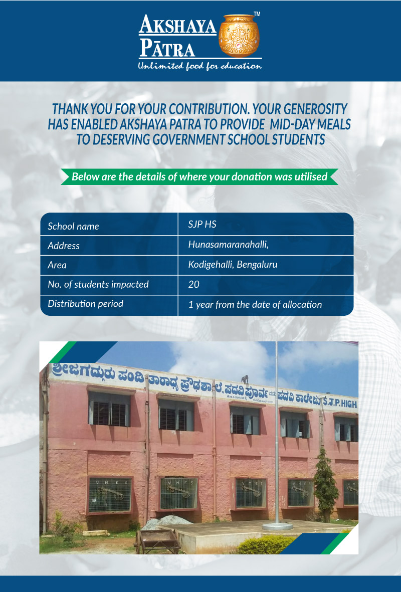 I am doing this campaign to raise awareness and funds for the Akshaya Patra Foundation. Funds raised would be used to provide wholesome school lunch to children in rural areas across Karnataka under the Mid-day meal program.