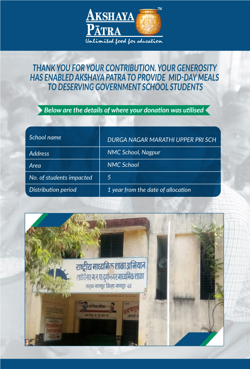 I am doing this campaign to raise awareness and funds for the Akshaya Patra Foundation. Funds raised would be used to provide wholesome school lunch to children in rural areas across Maharashtra (Mumbai, Thane, Vidarbha, etc.) under the Mid-day meal program.