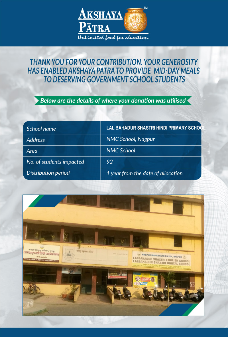 I am doing this campaign to raise awareness and funds for the Akshaya Patra Foundation. Funds raised would be used to provide wholesome school lunch to children in rural areas across Maharashtra (Mumbai, Thane, Vidarbha, etc.) under the Mid-day meal program.