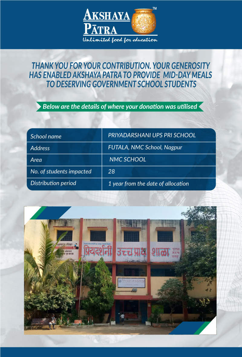 I am doing this campaign to raise awareness and funds for the Akshaya Patra Foundation. Funds raised would be used to provide wholesome school lunch to children in rural areas across Maharashtra (Mumbai, Thane, Vidarbha, etc.) under the Mid-day meal program.