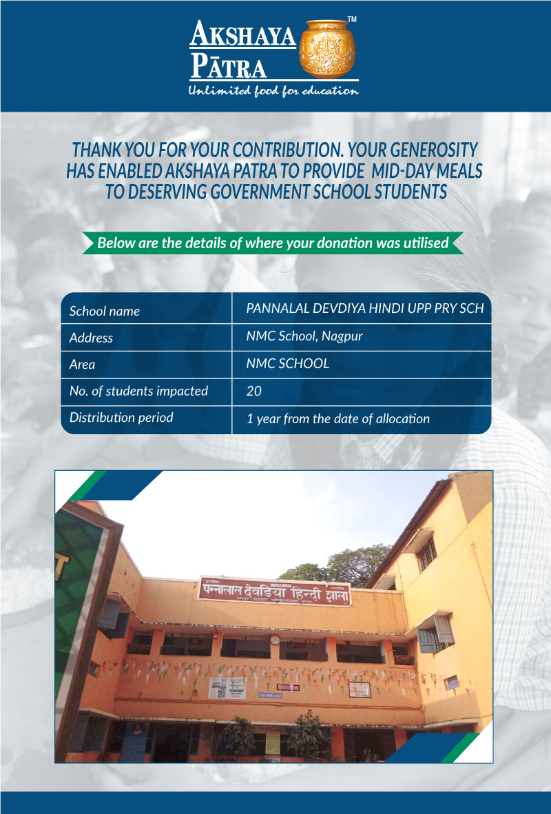I am doing this campaign to raise awareness and funds for the Akshaya Patra Foundation. Funds raised would be used to provide wholesome school lunch to children in rural areas across Maharashtra (Mumbai, Thane, Vidarbha, etc.) under the Mid-day meal program.