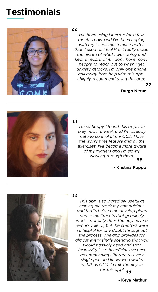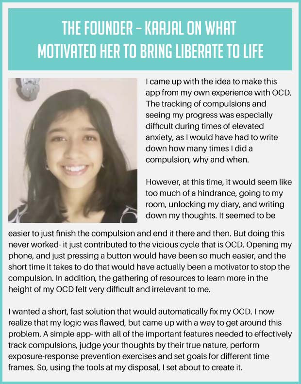 A 16-year-old student from Bangalore, Kaajal Gupta, has developed an app called “Liberate: My OCD Fighter” to help people suffering from OCD manage their lives better and is raising awareness through crowdfunding. Funds raised would primarily be used for increasing the Cloud-based storage and to accommodate more users, and to support the upcoming activities of School Ambassador Program (which includes spreading awareness on OCD and our app in schools by setting up a Liberate chapter). The funds will also be used to support the cost to attend Mental Health Conferences, registration of Liberate in certain competitions where a registration fee is required, a small token stipend to members working full time on Liberate and finally for printing banners, flyers, etc.