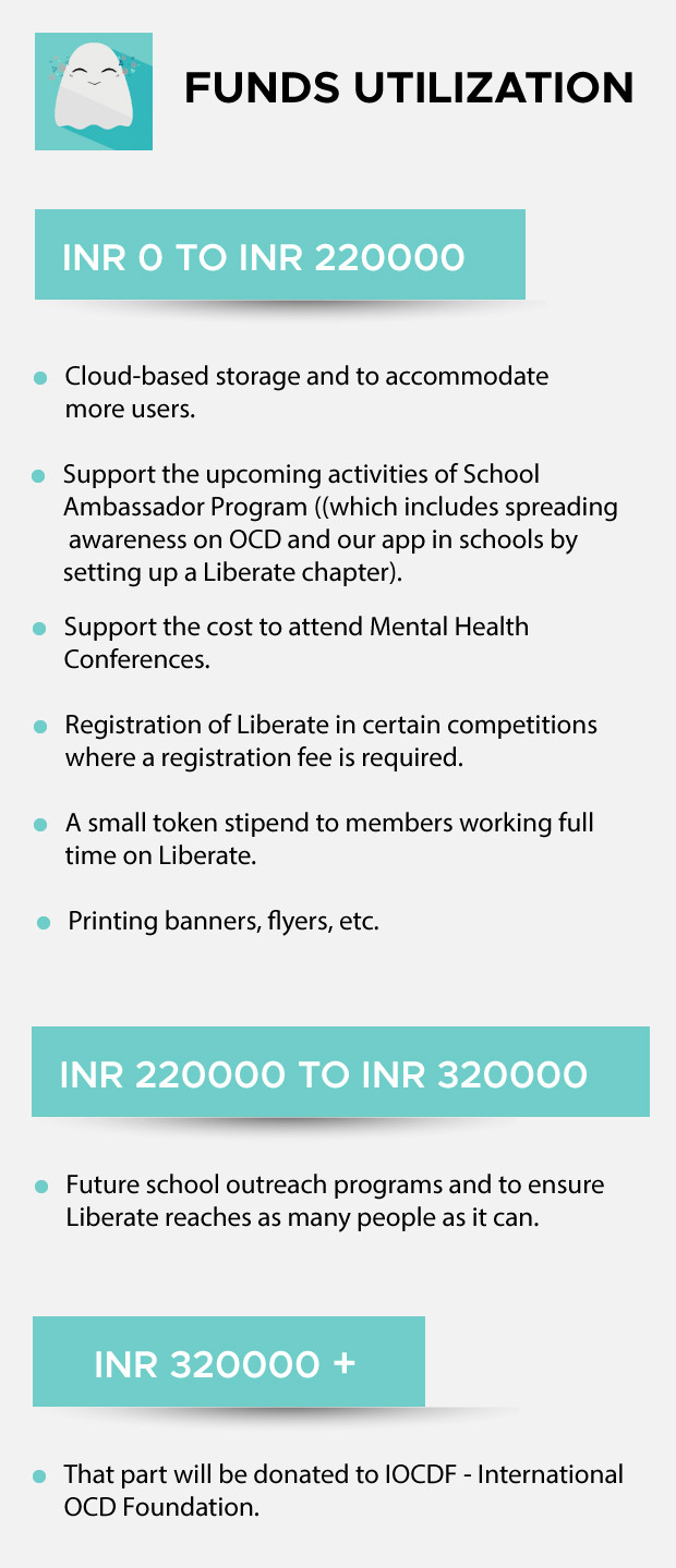 I am doing this campaign along with 21 other students from different parts of the world. I would like to raise INR 10000 or more. Together as a team of 22, we would like to raise a total of INR 220000 with this campaign. If together, we raise in between INR 220000 and INR 320000, we would like to save INR 100000 to further support and expand our student ambassador program in the present and future to more schools and to ensure Liberate reaches as many people as it can. And in case if we raise more anything more than INR 320000, we would like to donate the same to The International OCD Foundation (IOCDF).