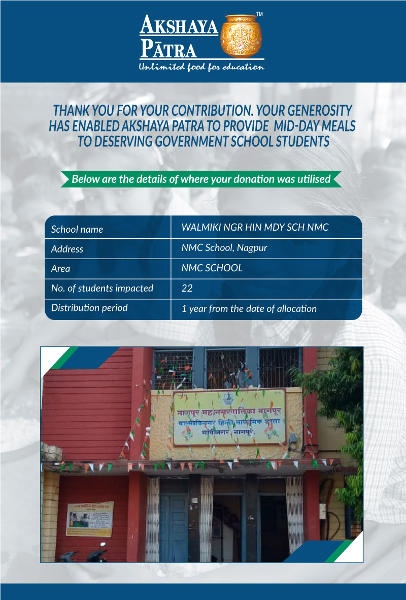 I am doing this campaign to raise awareness and funds for the Akshaya Patra Foundation. Funds raised would be used to provide wholesome school lunch to children in rural areas across Maharashtra (Mumbai, Thane, Vidarbha, etc.) under the Mid-day meal program.