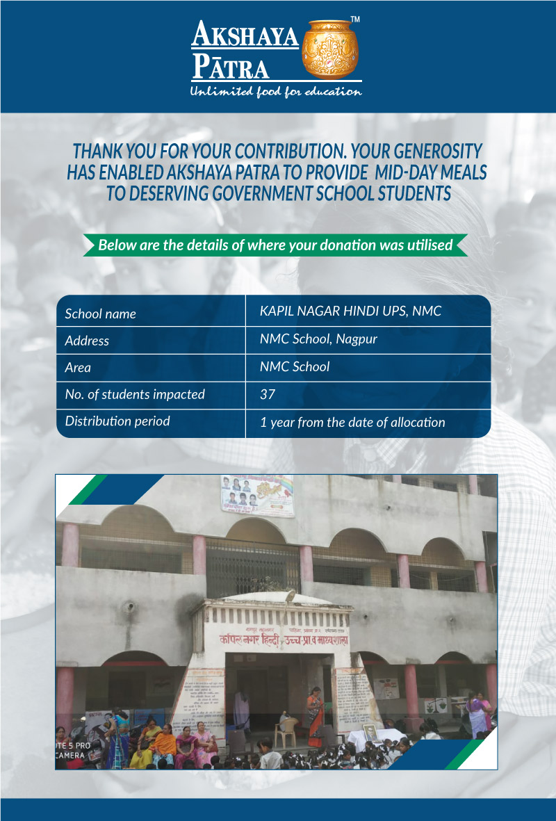I am doing this campaign to raise awareness and funds for the Akshaya Patra Foundation. Funds raised would be used to provide wholesome school lunch to children in rural areas across Maharashtra (Mumbai, Thane, Vidarbha, etc.) under the Mid-day meal program.