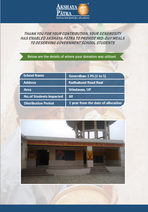 I am doing this campaign to raise awareness and funds for the Akshaya Patra Foundation. Funds raised would be used to provide wholesome school lunch to students studying at government schools across Delhi and UP under the Mid-day meal program.