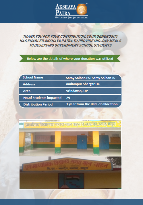 I am doing this campaign to raise awareness and funds for the Akshaya Patra Foundation. Funds raised would be used to provide wholesome school lunch to students studying at government schools across Delhi and UP under the Mid-day meal program.