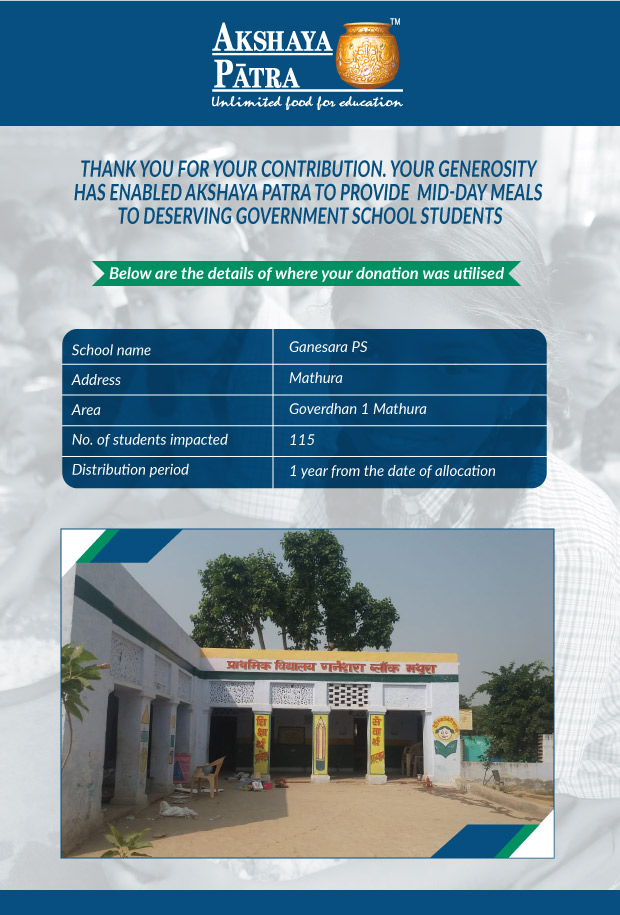 I am doing this campaign to raise awareness and funds for the Akshaya Patra Foundation. Funds raised would be used to provide wholesome school lunch to students studying at government schools across Delhi and UP under the Mid-day meal program.