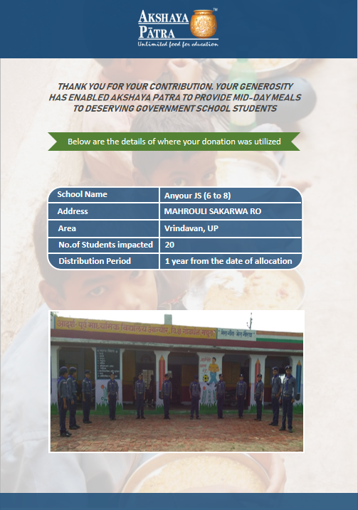 I am doing this campaign to raise awareness and funds for the Akshaya Patra Foundation. Funds raised would be used to provide wholesome school lunch to students studying at government schools across Delhi and UP under the Mid-day meal program.