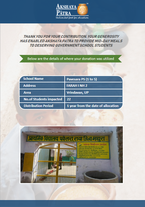 I am doing this campaign to raise awareness and funds for the Akshaya Patra Foundation. Funds raised would be used to provide wholesome school lunch to students studying at government schools across Delhi and UP under the Mid-day meal program.