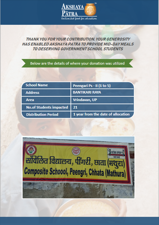 I am doing this campaign to raise awareness and funds for the Akshaya Patra Foundation. Funds raised would be used to provide wholesome school lunch to students studying at government schools across Delhi and UP under the Mid-day meal program.