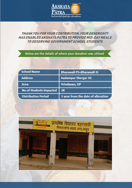 I am doing this campaign to raise awareness and funds for the Akshaya Patra Foundation. Funds raised would be used to provide wholesome school lunch to students studying at government schools across Delhi and UP under the Mid-day meal program.