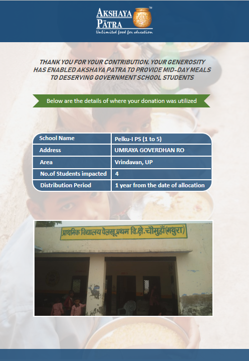 I am doing this campaign to raise awareness and funds for the Akshaya Patra Foundation. Funds raised would be used to provide wholesome school lunch to students studying at government schools across Delhi and UP under the Mid-day meal program.