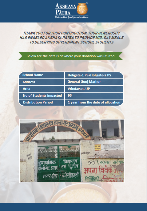 I am doing this campaign to raise awareness and funds for the Akshaya Patra Foundation. Funds raised would be used to provide wholesome school lunch to students studying at government schools across Delhi and UP under the Mid-day meal program.