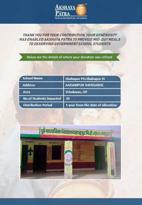 I am doing this campaign to raise awareness and funds for the Akshaya Patra Foundation. Funds raised would be used to provide wholesome school lunch to students studying at government schools across Delhi and UP under the Mid-day meal program.