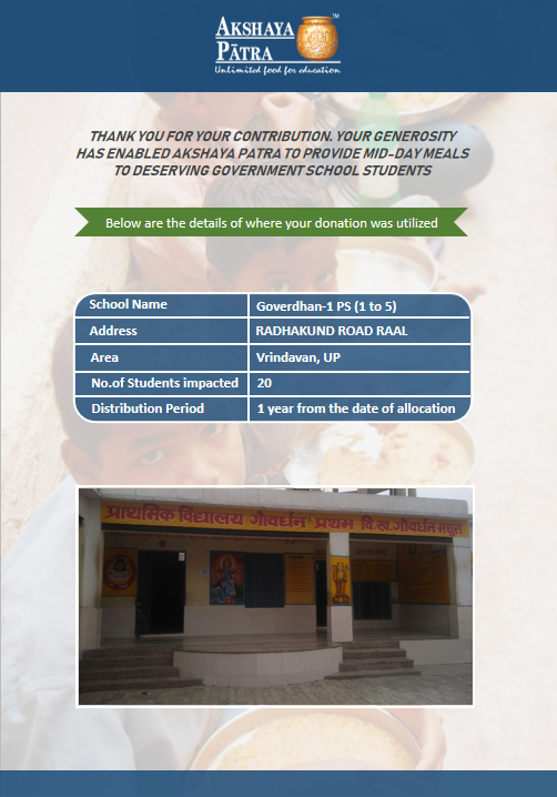 I am doing this campaign to raise awareness and funds for the Akshaya Patra Foundation. Funds raised would be used to provide wholesome school lunch to students studying at government schools across Delhi and UP under the Mid-day meal program.