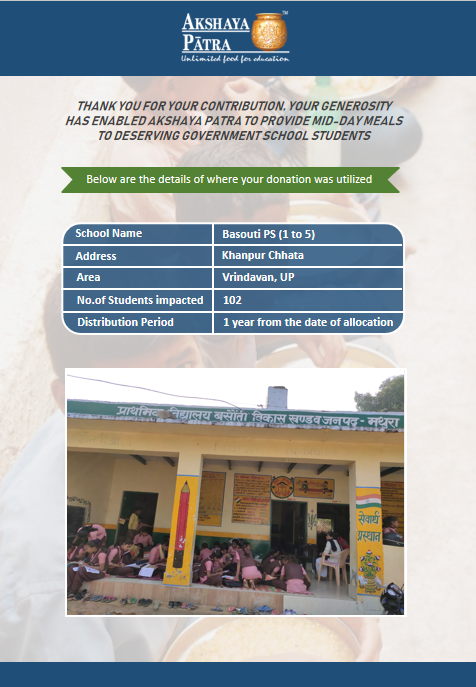 I am doing this campaign to raise awareness and funds for the Akshaya Patra Foundation. Funds raised would be used to provide wholesome school lunch to students studying at government schools across Delhi and UP under the Mid-day meal program.