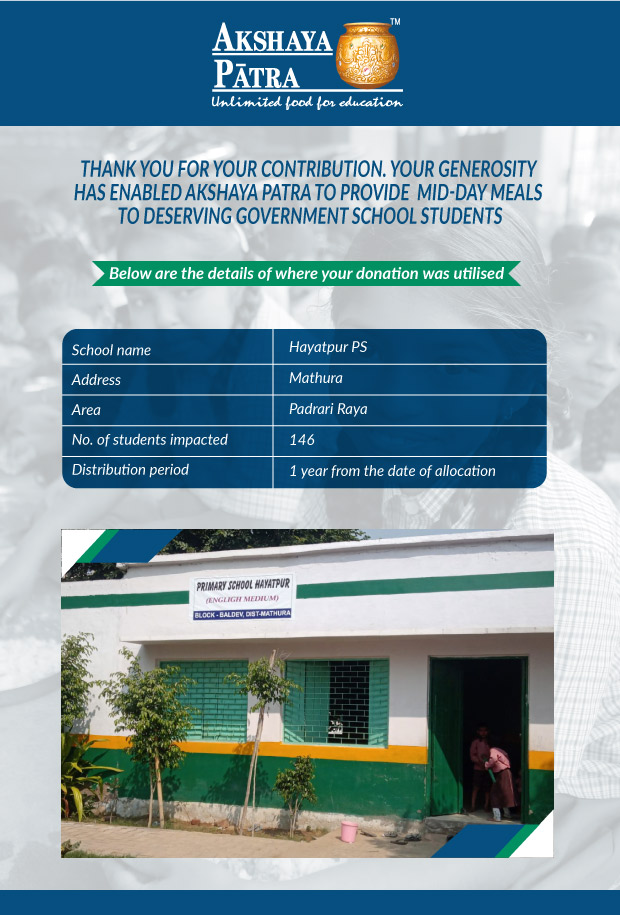 I am doing this campaign to raise awareness and funds for the Akshaya Patra Foundation. Funds raised would be used to provide wholesome school lunch to students studying at government schools across Delhi and UP under the Mid-day meal program.