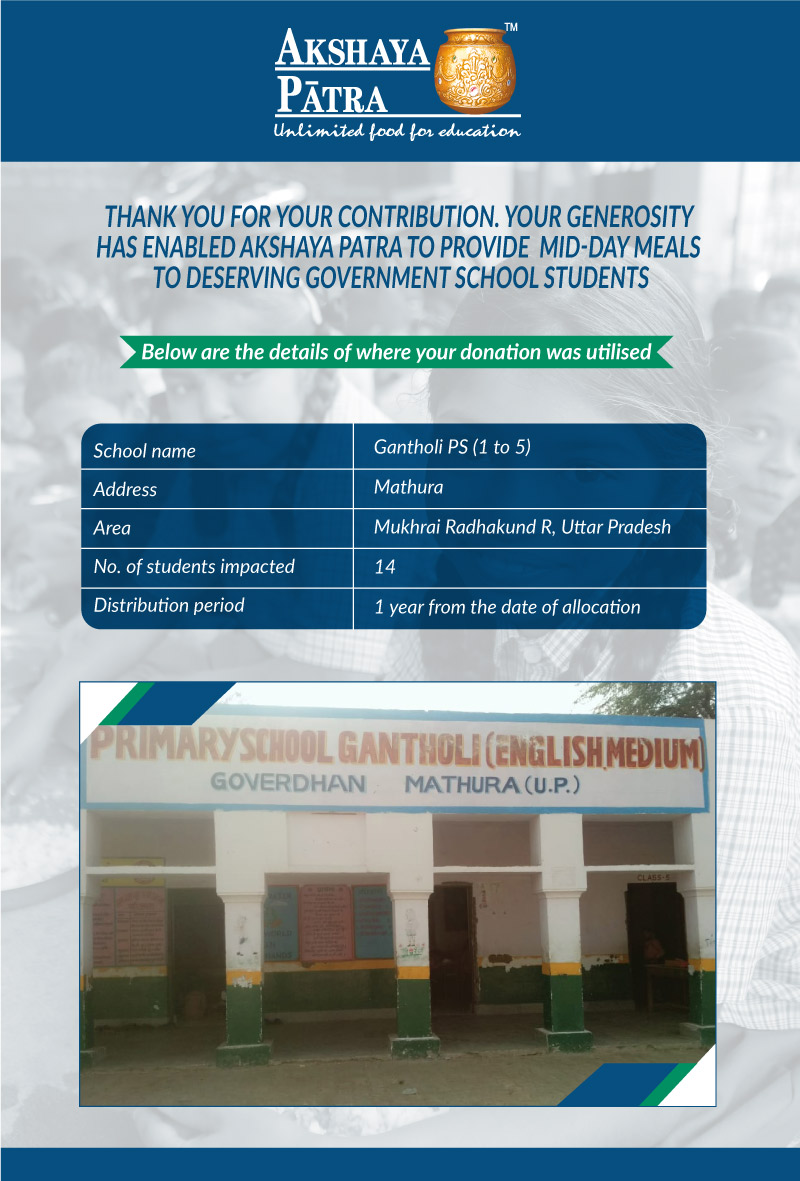 I am doing this campaign to raise awareness and funds for the Akshaya Patra Foundation. Funds raised would be used to provide wholesome school lunch to students studying at government schools across Delhi and UP under the Mid-day meal program.