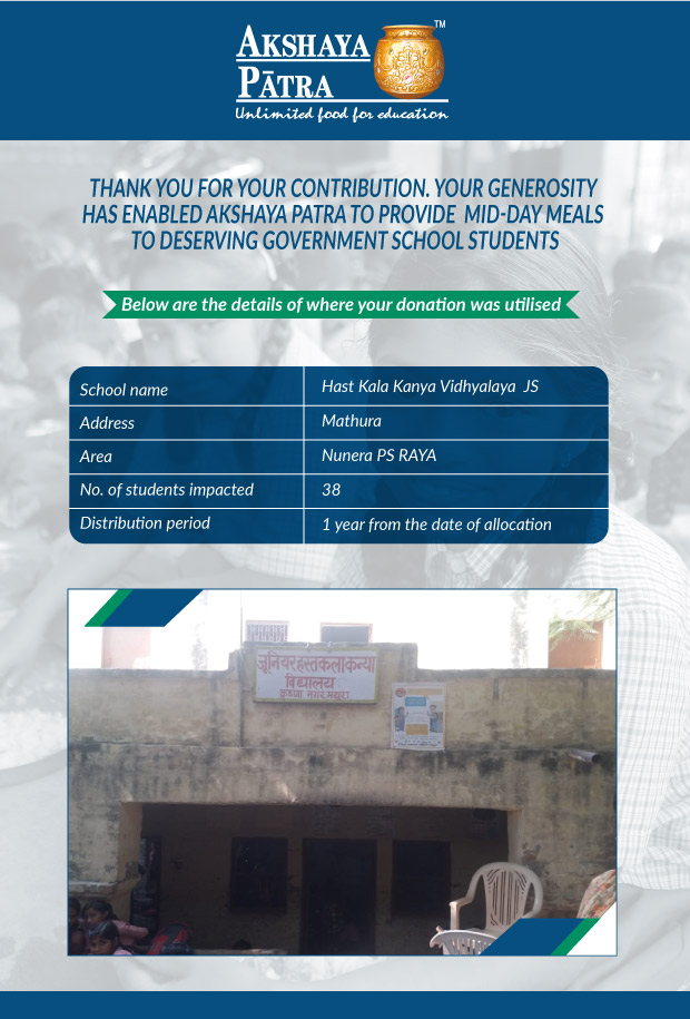I am doing this campaign to raise awareness and funds for the Akshaya Patra Foundation. Funds raised would be used to provide wholesome school lunch to students studying at government schools across Delhi and UP under the Mid-day meal program.