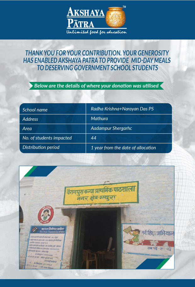 I am doing this campaign to raise awareness and funds for the Akshaya Patra Foundation. Funds raised would be used to provide wholesome school lunch to students studying at government schools across Delhi and UP under the Mid-day meal program.