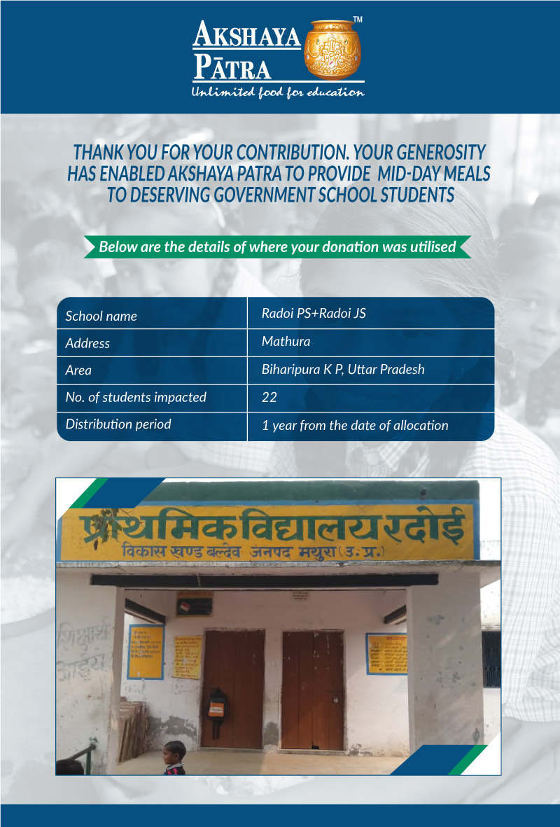 I am doing this campaign to raise awareness and funds for the Akshaya Patra Foundation. Funds raised would be used to provide wholesome school lunch to students studying at government schools across Delhi and UP under the Mid-day meal program.