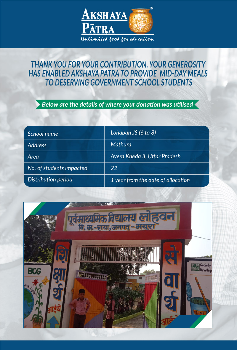 I am doing this campaign to raise awareness and funds for the Akshaya Patra Foundation. Funds raised would be used to provide wholesome school lunch to students studying at government schools across Delhi and UP under the Mid-day meal program.