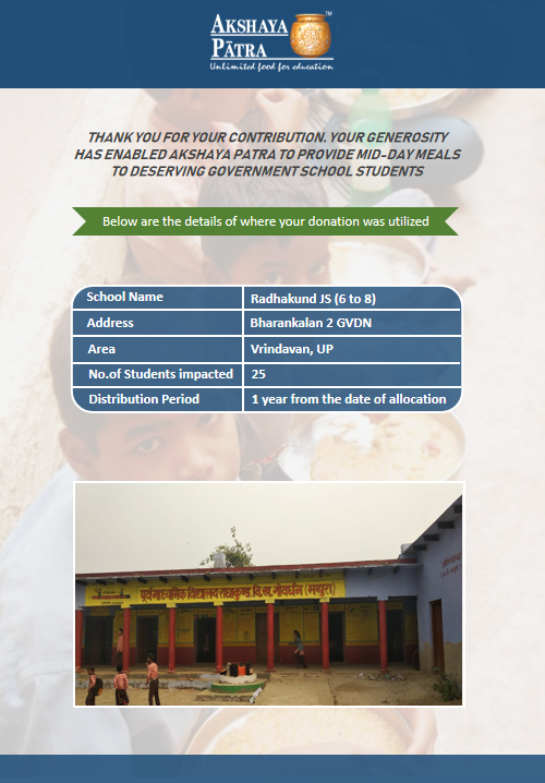 I am doing this campaign to raise awareness and funds for the Akshaya Patra Foundation. Funds raised would be used to provide wholesome school lunch to students studying at government schools across Delhi and UP under the Mid-day meal program.