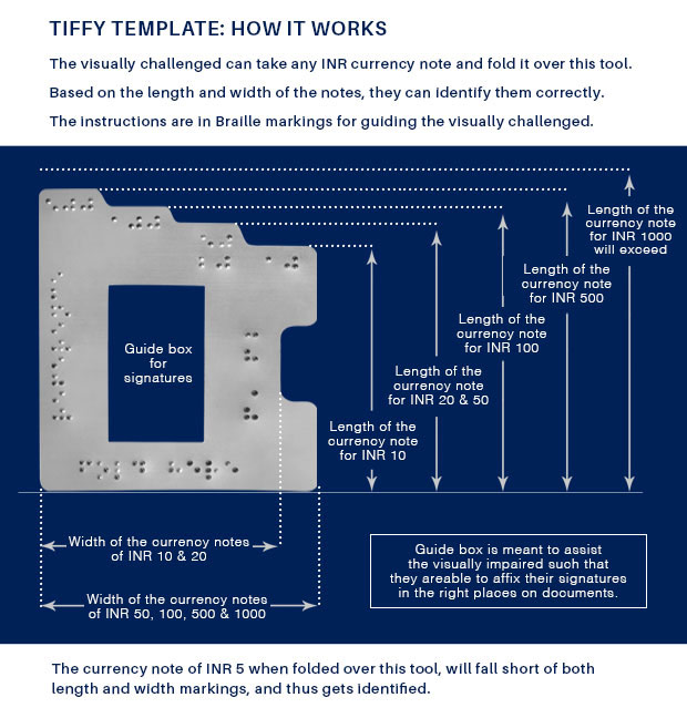This solution is made up of a simple piece of PVC. The structure of this board allows the user to measure the currency notes accurately based on length, width and Braille markings. It helps Tiffy tell notes apart and only costs two rupees.
