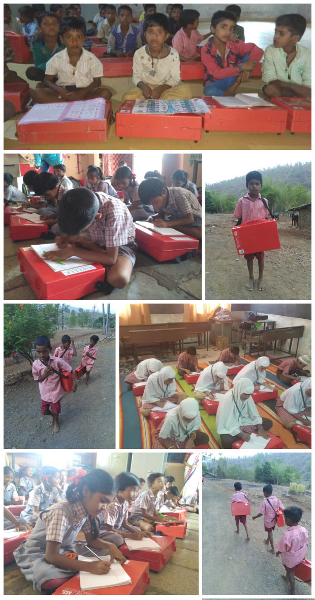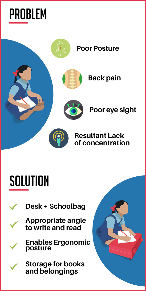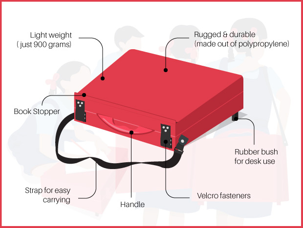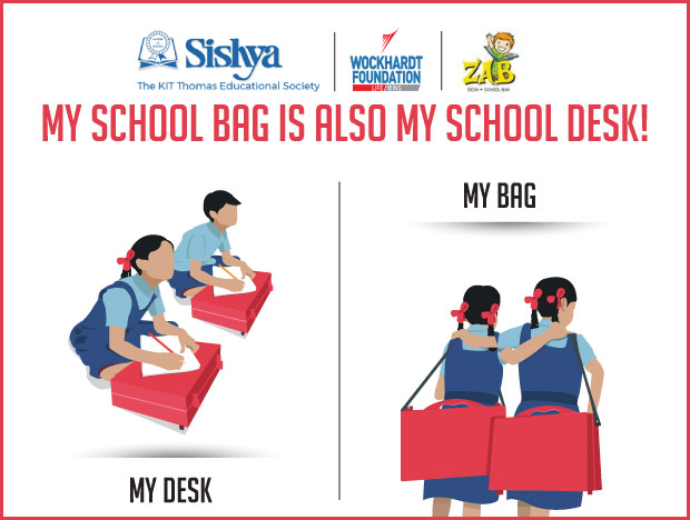 ZAB is an intelligently designed school bag that helps children to carry their books and belongings irrespective of weather conditions. The same bag, with no mechanics, transforms into a school desk. The desk offers an appropriate angle for students to write and read, thereby enabling an ergonomic posture while studying
