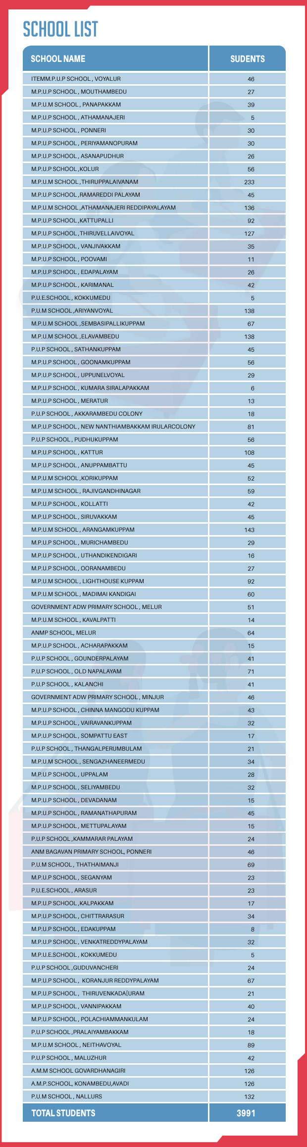 The below graphics shows a total of 3991 students across 80 different schools in Tamil Nadu. We could distribute to more students if we raise more funds. This will help bring more smiles and cheers to students in rural schools.