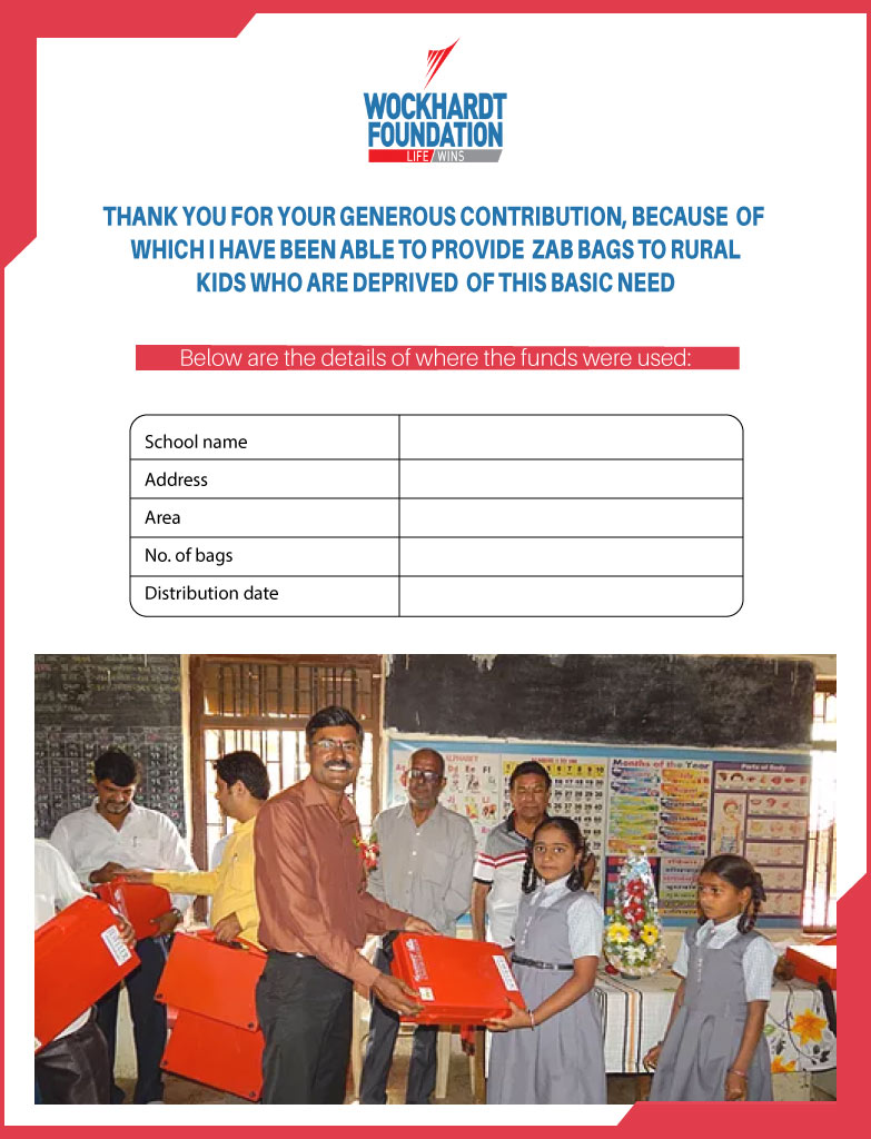 I am doing this crowdfunding campaign in partnership with the Wockhardt Foundation. They get the ZAB (DESK+SCHOOL BAG) manufactured through their vendors. Wockhardt Foundation identifies the schools and the students who would require the bag and delivers them to the school, thereby transforming the lives of students in rural areas.