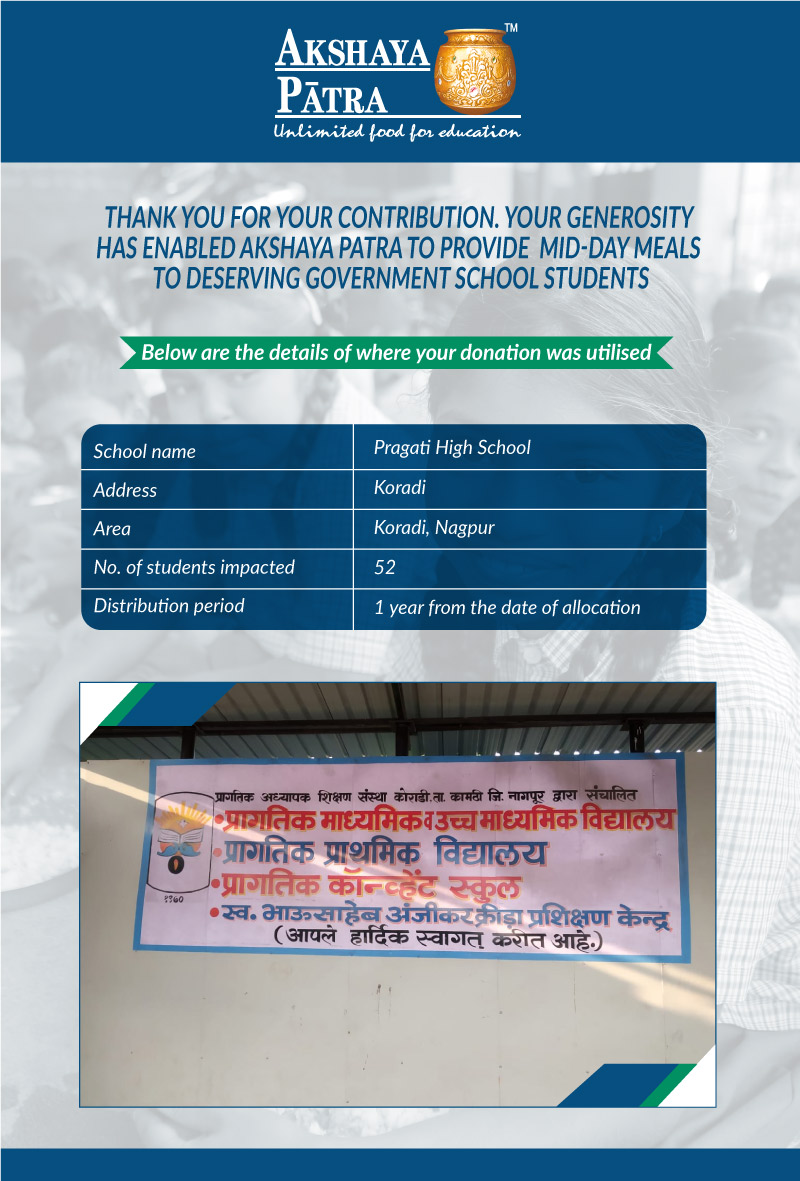 I am doing this campaign to raise awareness and funds for the Akshaya Patra Foundation. Funds raised would be used to provide wholesome school lunch to children in rural areas across Maharashtra (Mumbai, Thane, Vidarbha, etc.) under the Mid-day meal program.
