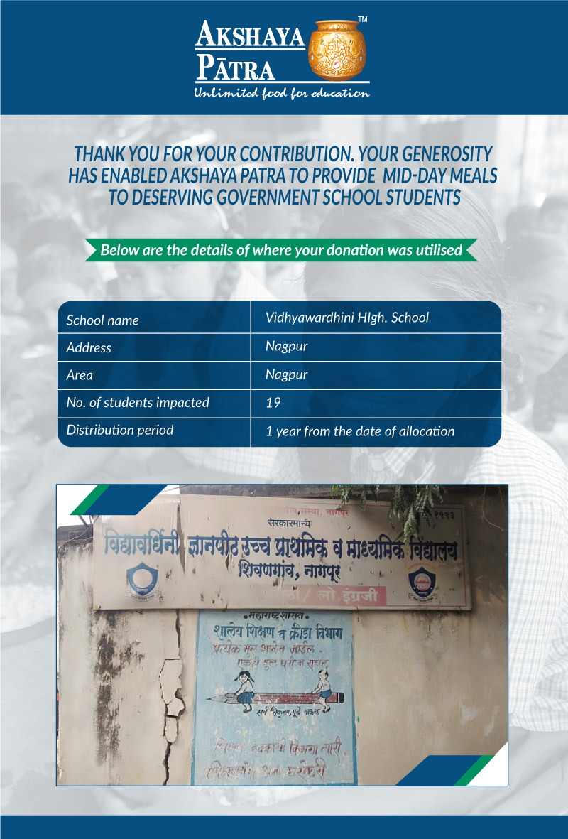 I am doing this campaign to raise awareness and funds for the Akshaya Patra Foundation. Funds raised would be used to provide wholesome school lunch to children in rural areas across Maharashtra (Mumbai, Thane, Vidarbha, etc.) under the Mid-day meal program.