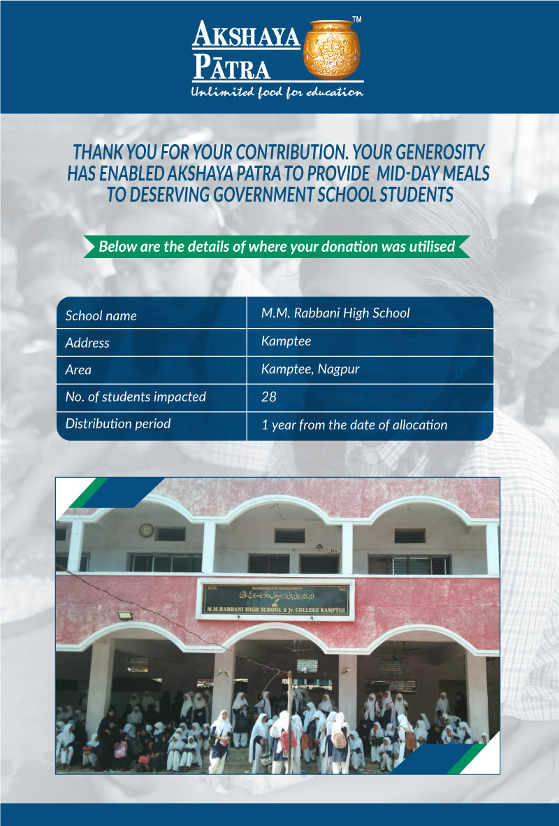 I am doing this campaign to raise awareness and funds for the Akshaya Patra Foundation. Funds raised would be used to provide wholesome school lunch to children in rural areas across Maharashtra (Mumbai, Thane, Vidarbha, etc.) under the Mid-day meal program.