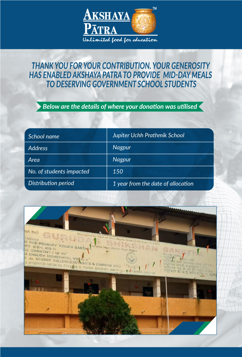 I am doing this campaign to raise awareness and funds for the Akshaya Patra Foundation. Funds raised would be used to provide wholesome school lunch to children in rural areas across Maharashtra (Mumbai, Thane, Vidarbha, etc.) under the Mid-day meal program.