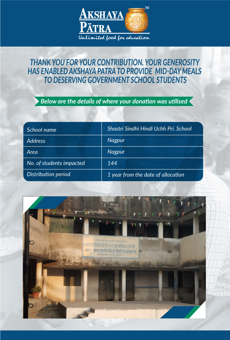 I am doing this campaign to raise awareness and funds for the Akshaya Patra Foundation. Funds raised would be used to provide wholesome school lunch to children in rural areas across Maharashtra (Mumbai, Thane, Vidarbha, etc.) under the Mid-day meal program.